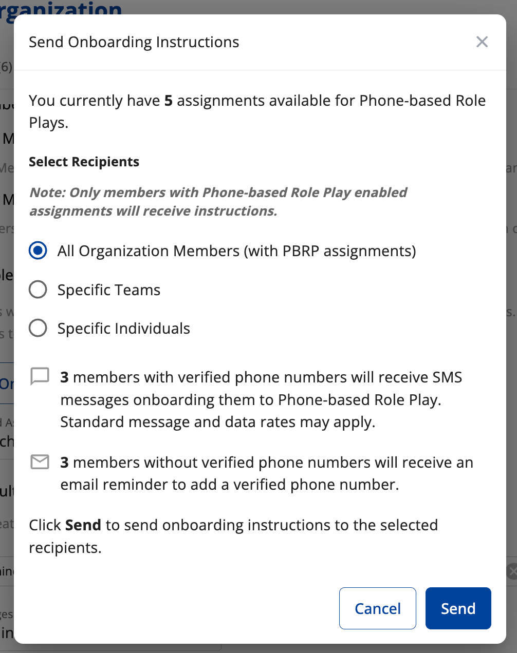 2. Select the whole org, by team, or by user to send onboarding instructions.
