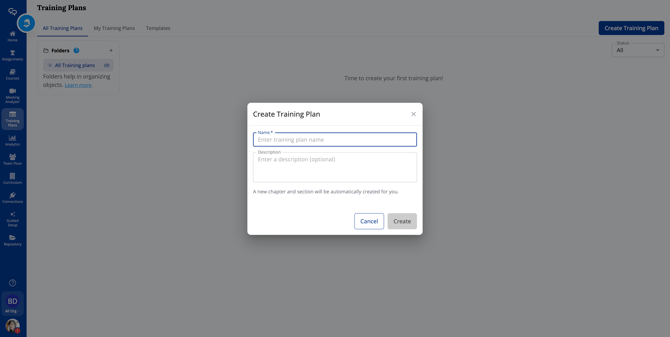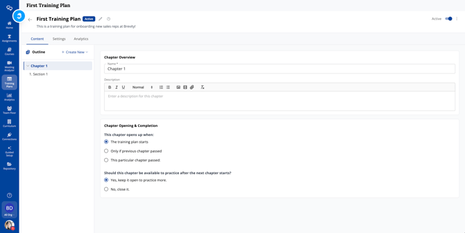 Navigate to Training Plans in main navigation menu. Click Create Training Plan, enter a name and description, and save. Brevity automatically creates your first Chapter and Section to get you started.