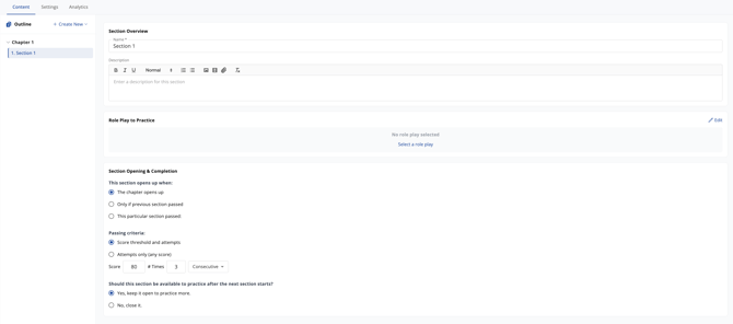 Set the Section opening rule and passing criteria — a minimum score, required number of attempts, or both. These are what the rep must achieve before the next Section unlocks.