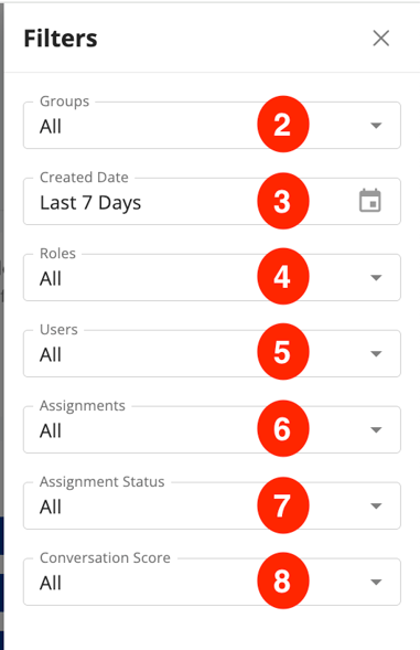 - Use the Conversation Score filter to filter data by a score threshold -- e.g. exclude any attempts below your goal score for an assignment or exclude sessions that the user likely ended early (scores < 30 likely indicate an incomplete session).