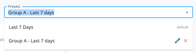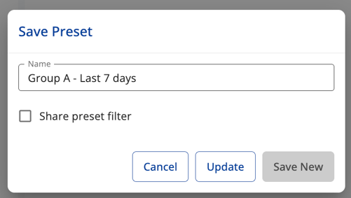 When you want to reuse a specific combination of filters, you can save that combination as a preset in order to quickly access the same data in the future. This is useful, for example, if you want to create presets to quickly access data for various groups over the last seven days. To create a preset: