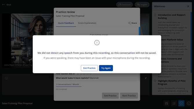 You may see a pop-up indicating no audio was detected and that the session won’t be saved.