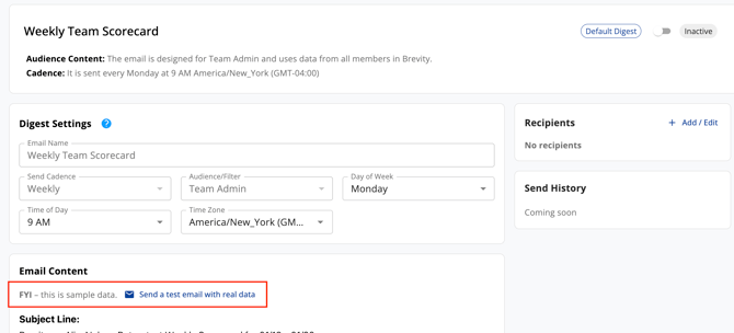 - The test email only goes to you, regardless of who is listed as a recipient on the digest.
